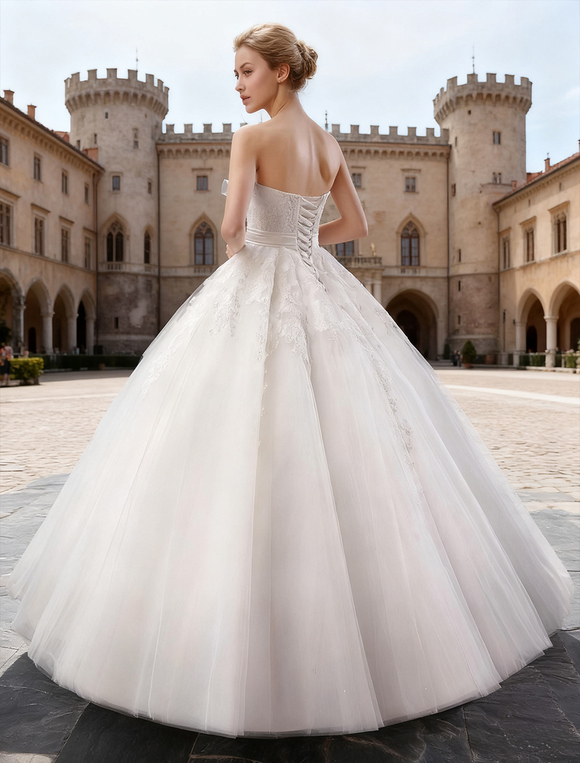 | Verzierung | Spitze, Perlen-Applikation, gefaltet, Gürtel | Details auf dem Rücken | Schnürung |