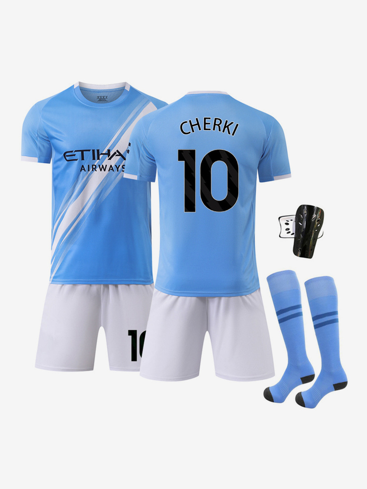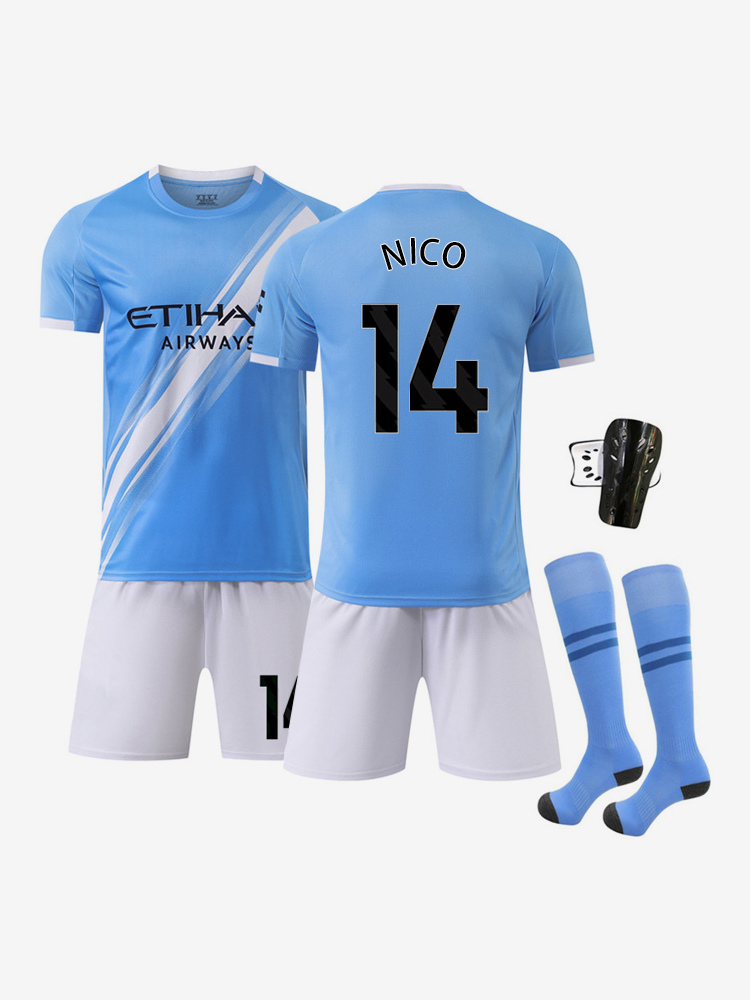 25/26 N. 10 CHERKI N. 14 NICO Maglia da calcio a maniche corte blu e bianca 4 pezzi abbigliamento sportivo per adulti e bambini